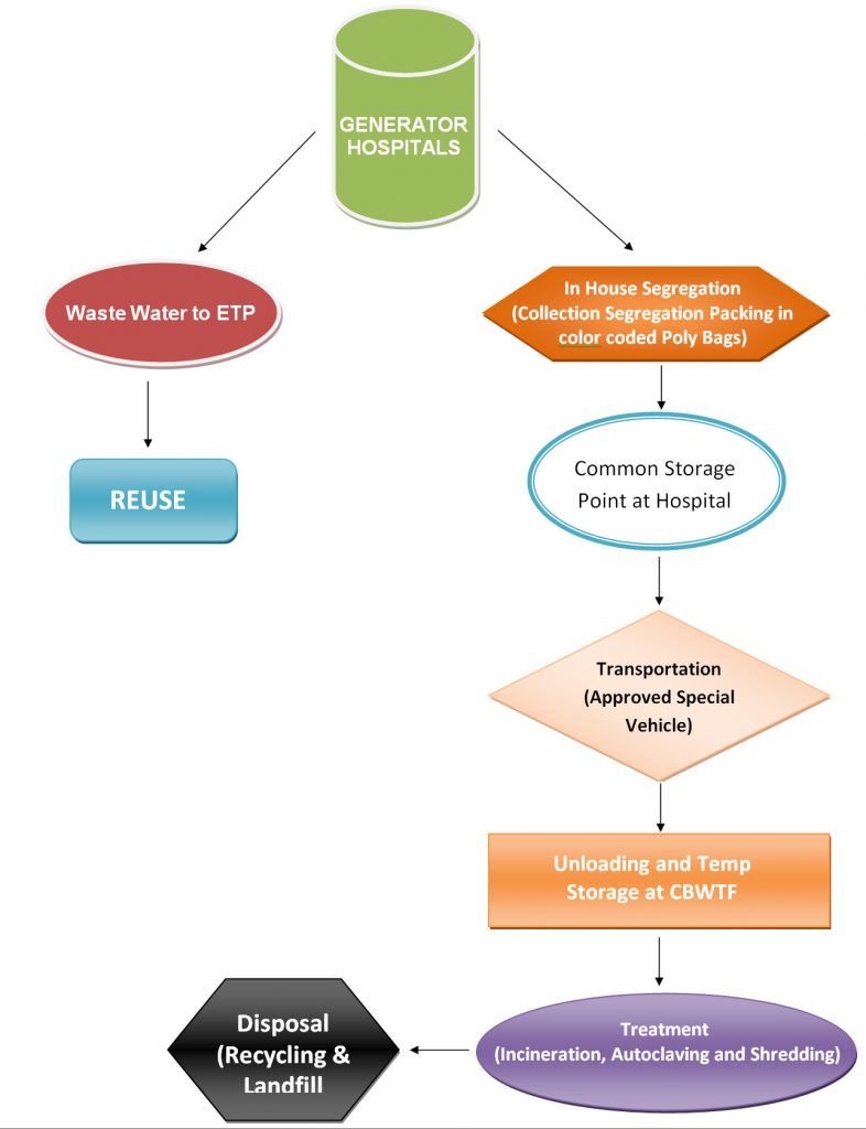 Services Provided Collection of segregated Bio-Medical Waste Transportation to CBWTF Unloading the Vehicle to the temporary storage room at site Fumigating / disinfecting / cleaning of vehicle Categories / batch wise treatment of collected waste by incineration, Autoclave & Shredder Effluent treatment of the water generated during treatment of Bio-Medical Waste & reuse of Treated waster for Plantation / cleaning purposes Storing the ash from Incinerator for Secured Land Fills / Municipal Land Fills Autoclaved & Shredded disinfected waste to be recycled